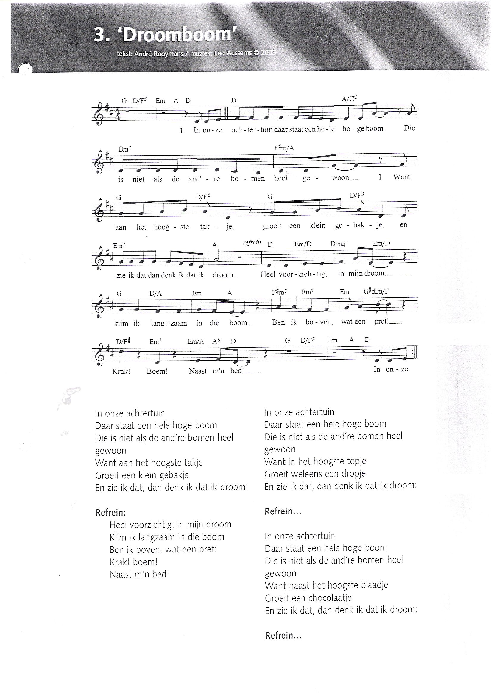 Er wordt gedroomd over een magische boom waar allerlei snoepjes en gebakjes aan groeien. In deze droom klimmen de kinderen omhoog om daar iets van te pakken, maar als ze de top bijna bereikt hebben vallen ze omlaag en liggen ze opeens naast hun bed; ze zijn wakker geworden. Dit kan allemaal door de kinderen uitgebeeld worden, door ze hoog en laag te laten bewegen. Het lied vertelt een verhaal waar een hoop lespotentie in zit(klimmen, dromen, vallen, boom etc.); je kunt de kinderen er een hoop mee laten doen. Voor het aanleren van het liedje is het een suggestie om de kinderen bij elk stukje nieuwe tekst een bepaalde beweging aan te leren, of door bijvoorbeeld met picto’s te werken. Dit lied kan op elk akkoordinstrument begeleid worden(bij veel beweging: bij voorkeur gitaar).